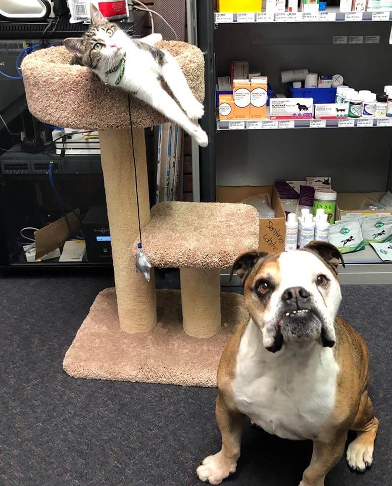 Leroy, the gorgeous 10 year old Aussie Bulldog often spends his days puttering around the clinic, where he begs the nurses for their lunch, attempts to steal all the toys from the puppy school room, and enjoys a good scratch. We would absolutely love to claim Leroy as our other clinic pet, but in reality, Leroy is Dr Toms much loved brother in arms and comrade.